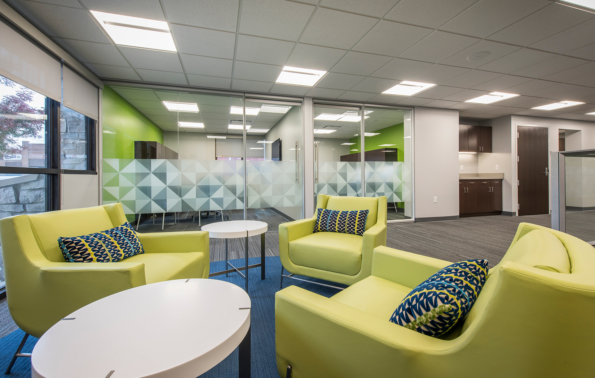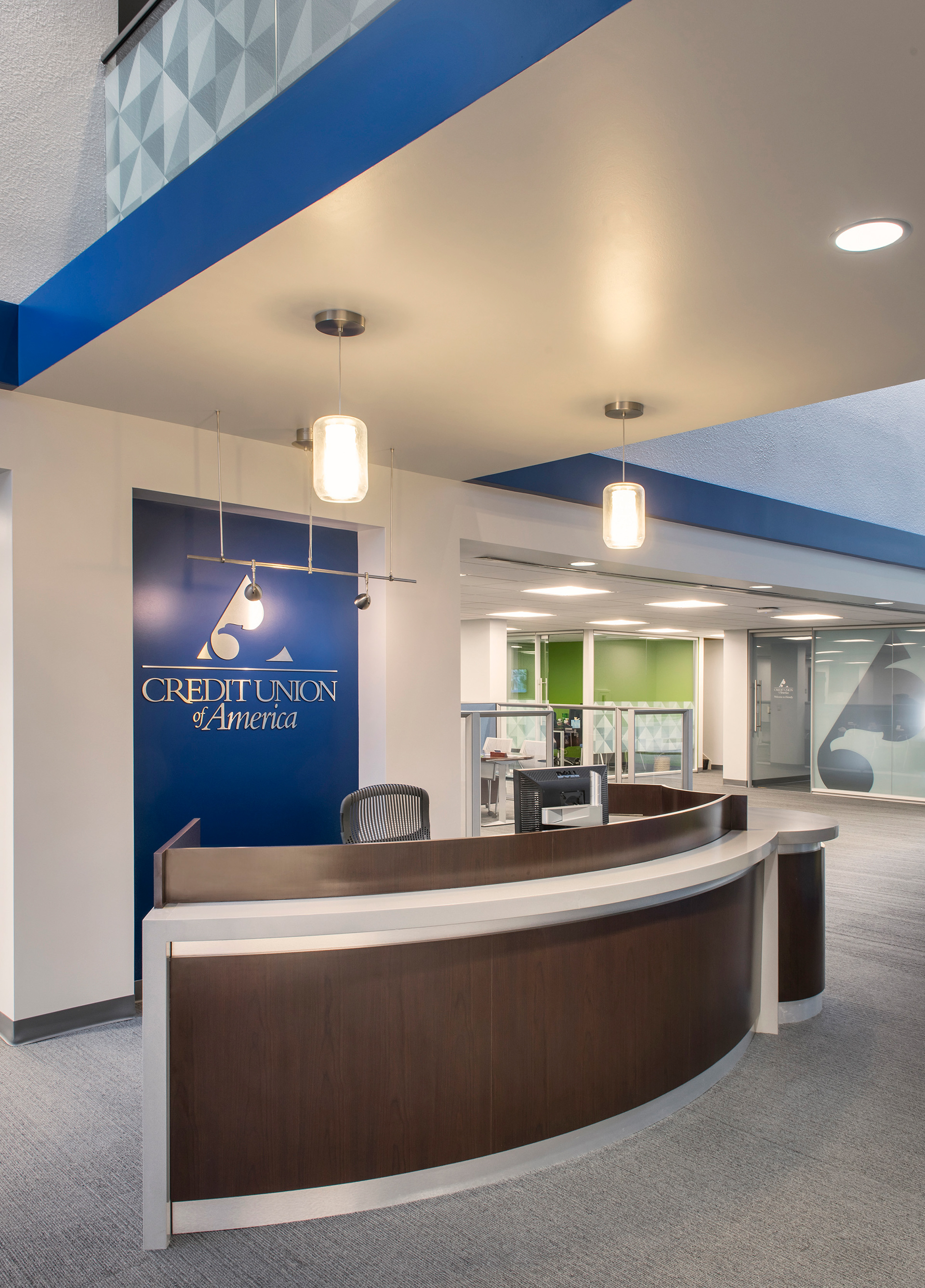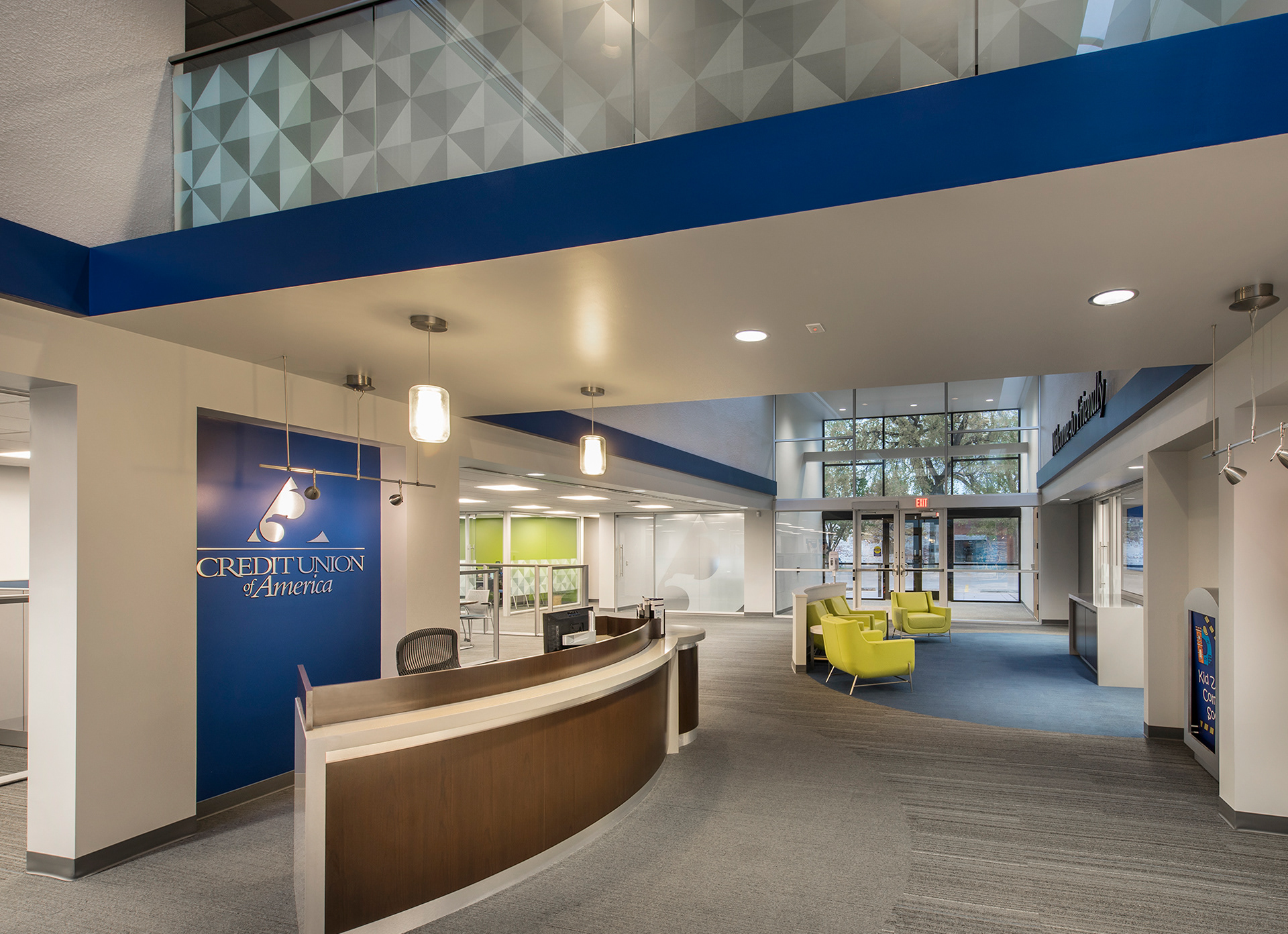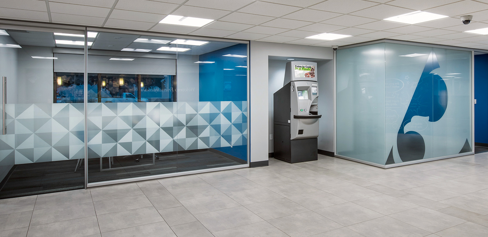 Large-format graphics welcome members and reinforce the brand throughout the credit union's retail spaces.